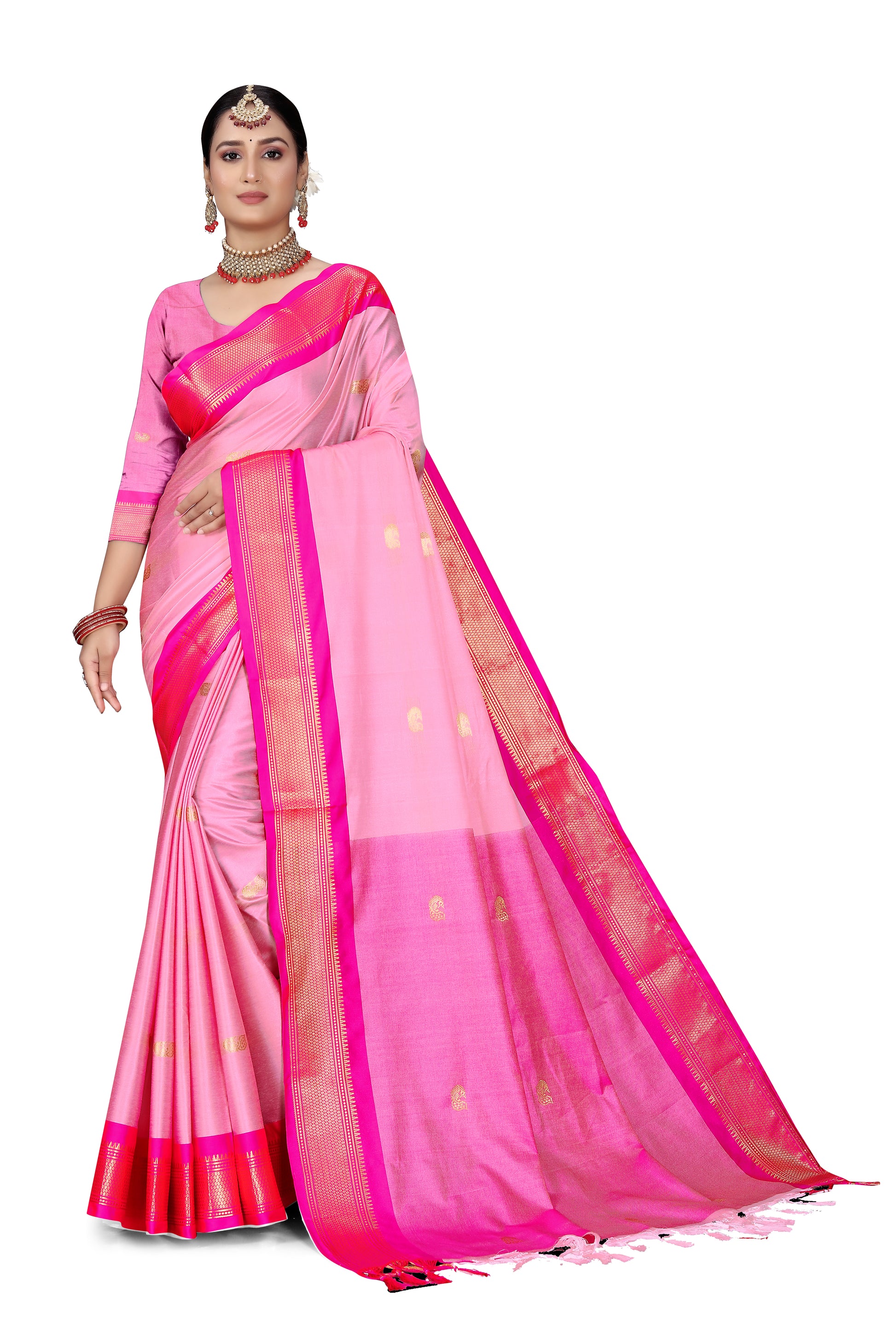 Measuring 5.5 meters, this saree is perfect for weddings, festivals, or parties. The matching blouse piece (0.80 meters) allows you to complete a coordinated look. Whether you're attending a formal event or simply wish to add a touch of luxury to your wardrobe, this Baby Pink and Dark Pink cotton silk saree will make you stand out in style.