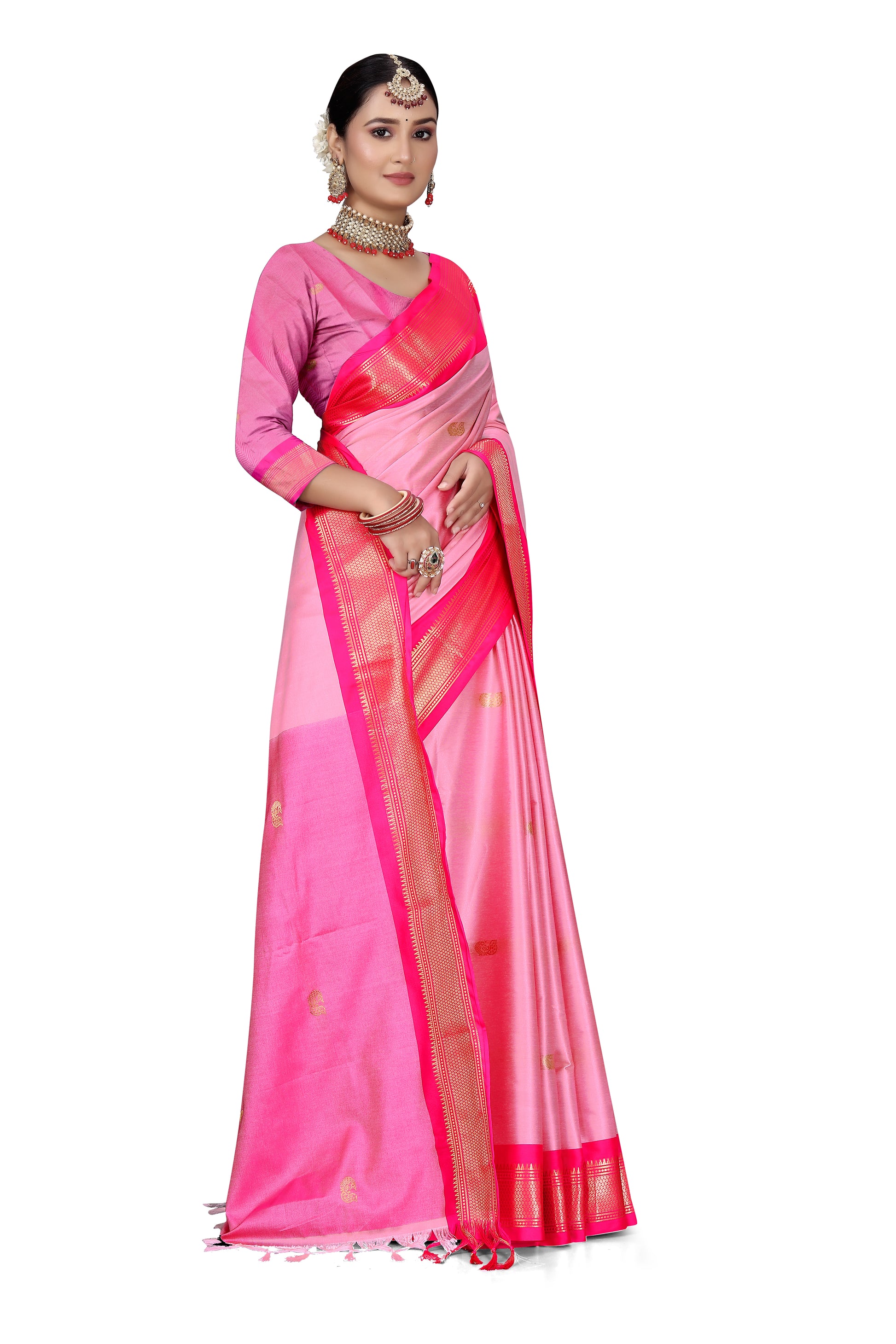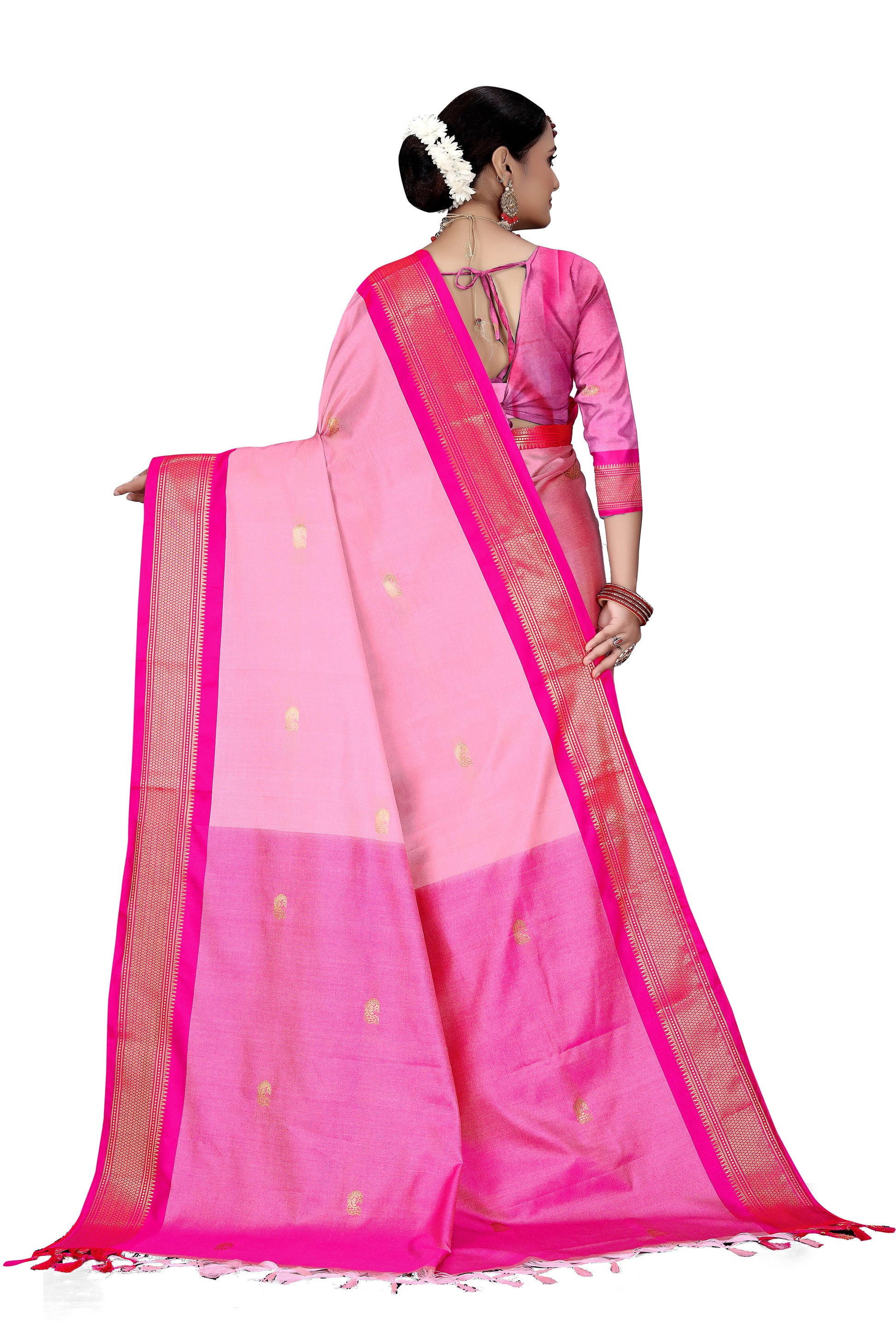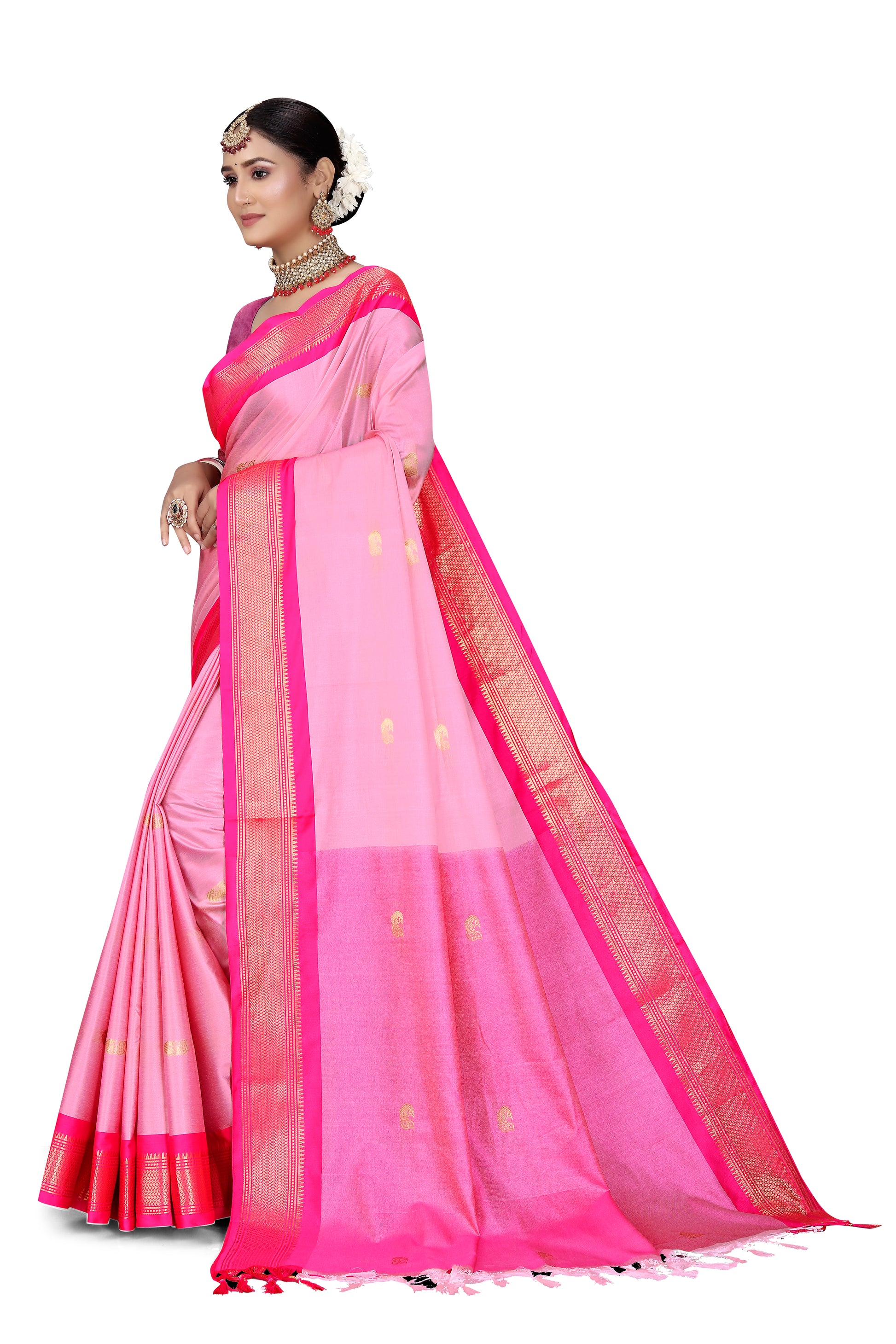Baby Pink And Border Dark Pink Paithani Cotton Silk Saree With Contrast Blouse And Contrast Plain Pallu With Golden Zari Butta