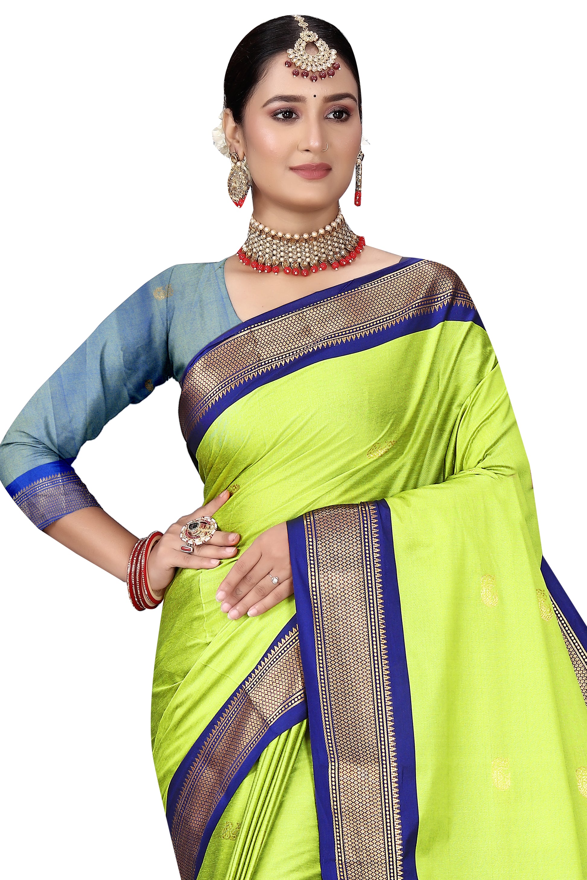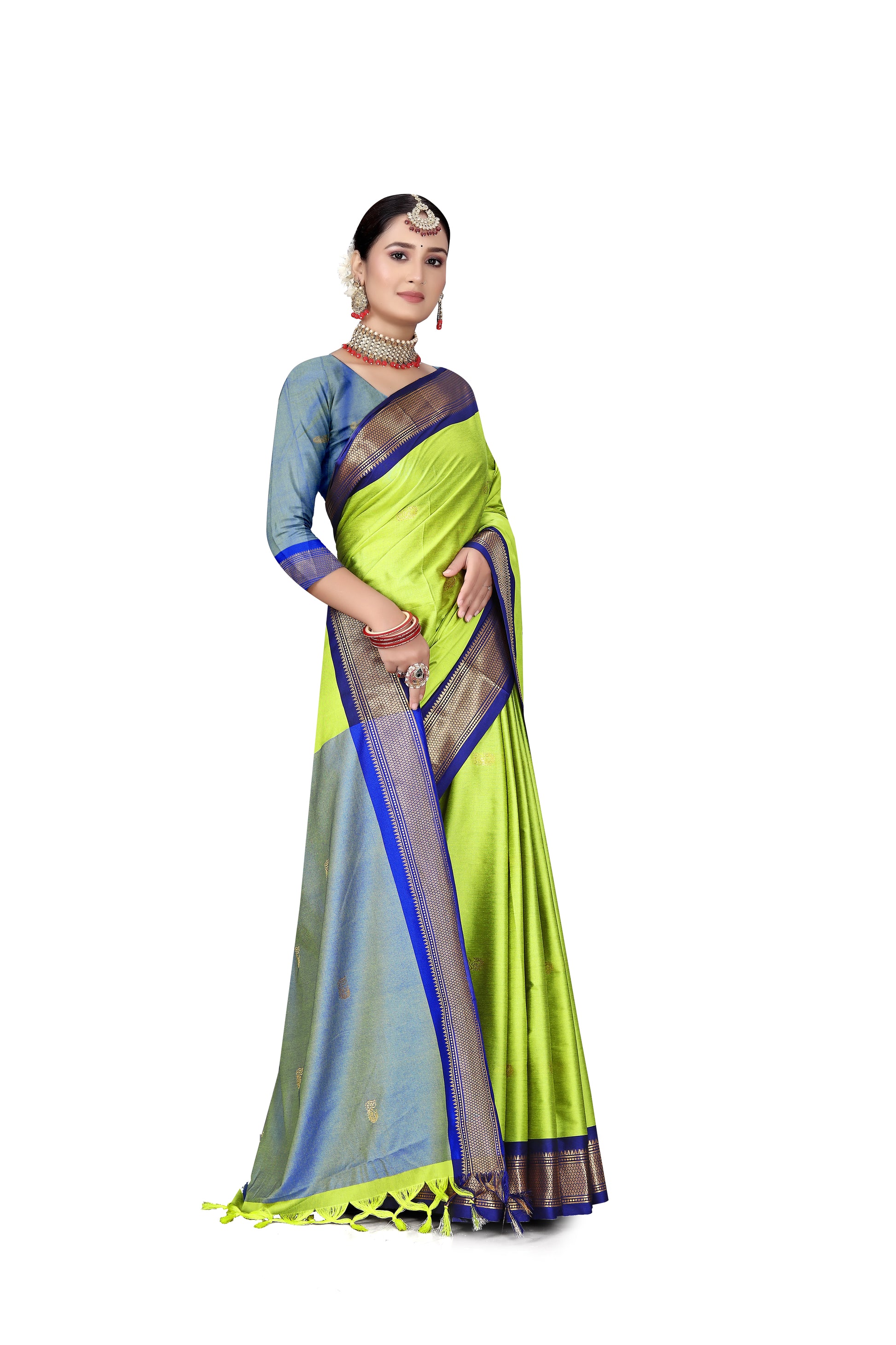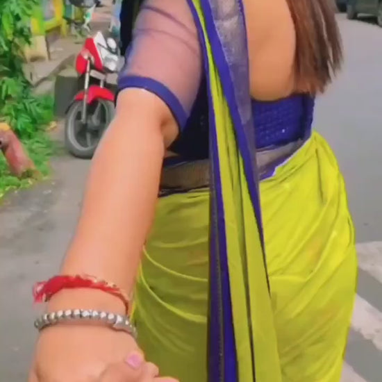Measuring 5.5 meters, this saree is perfect for weddings, festivals, or parties. The matching blouse piece (0.80 meters) allows you to complete a coordinated look. Whether you're attending a formal event or simply wish to add a touch of luxury to your wardrobe, this Lemon and Navy Blue silk saree will make you stand out in style.