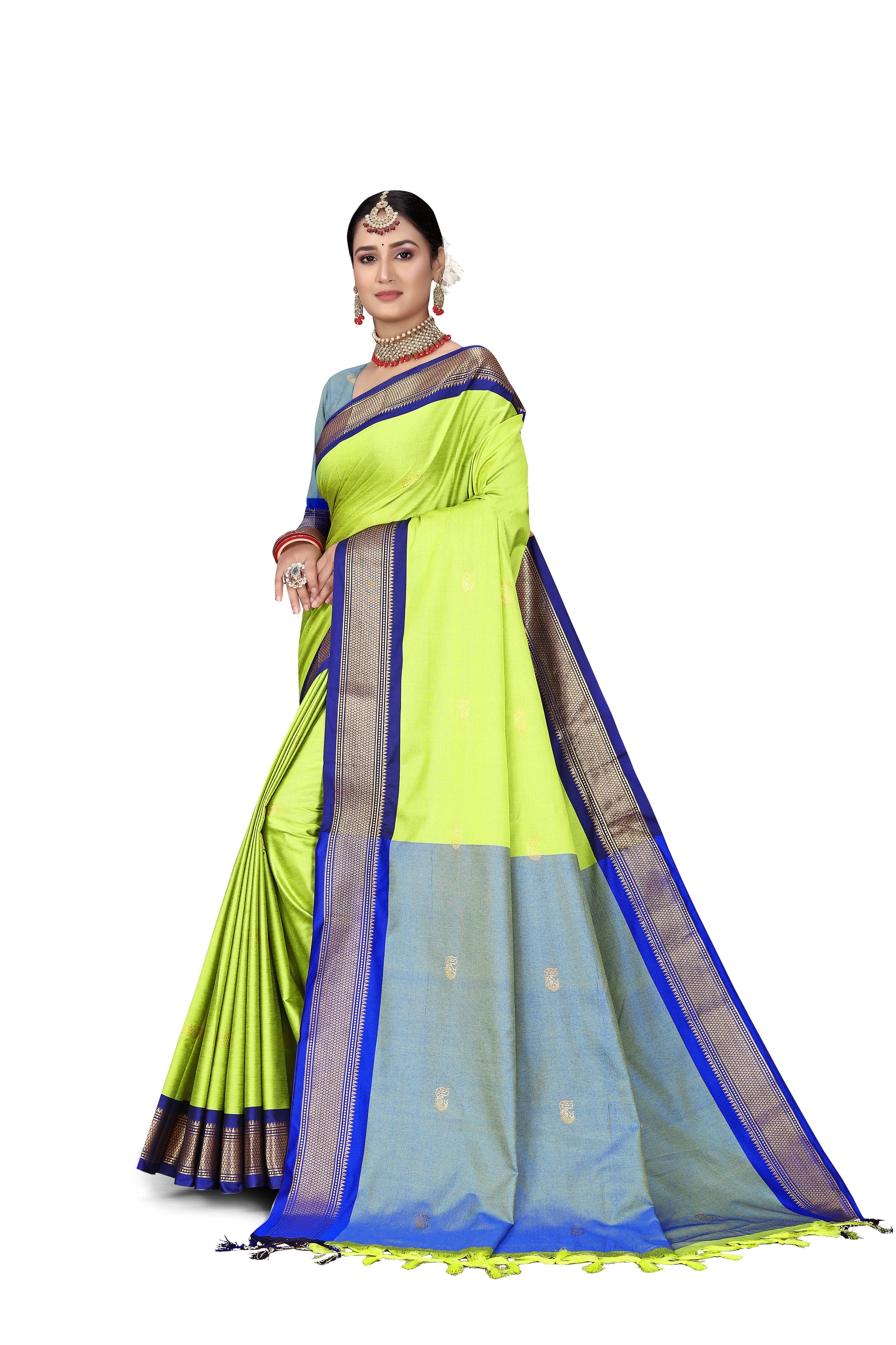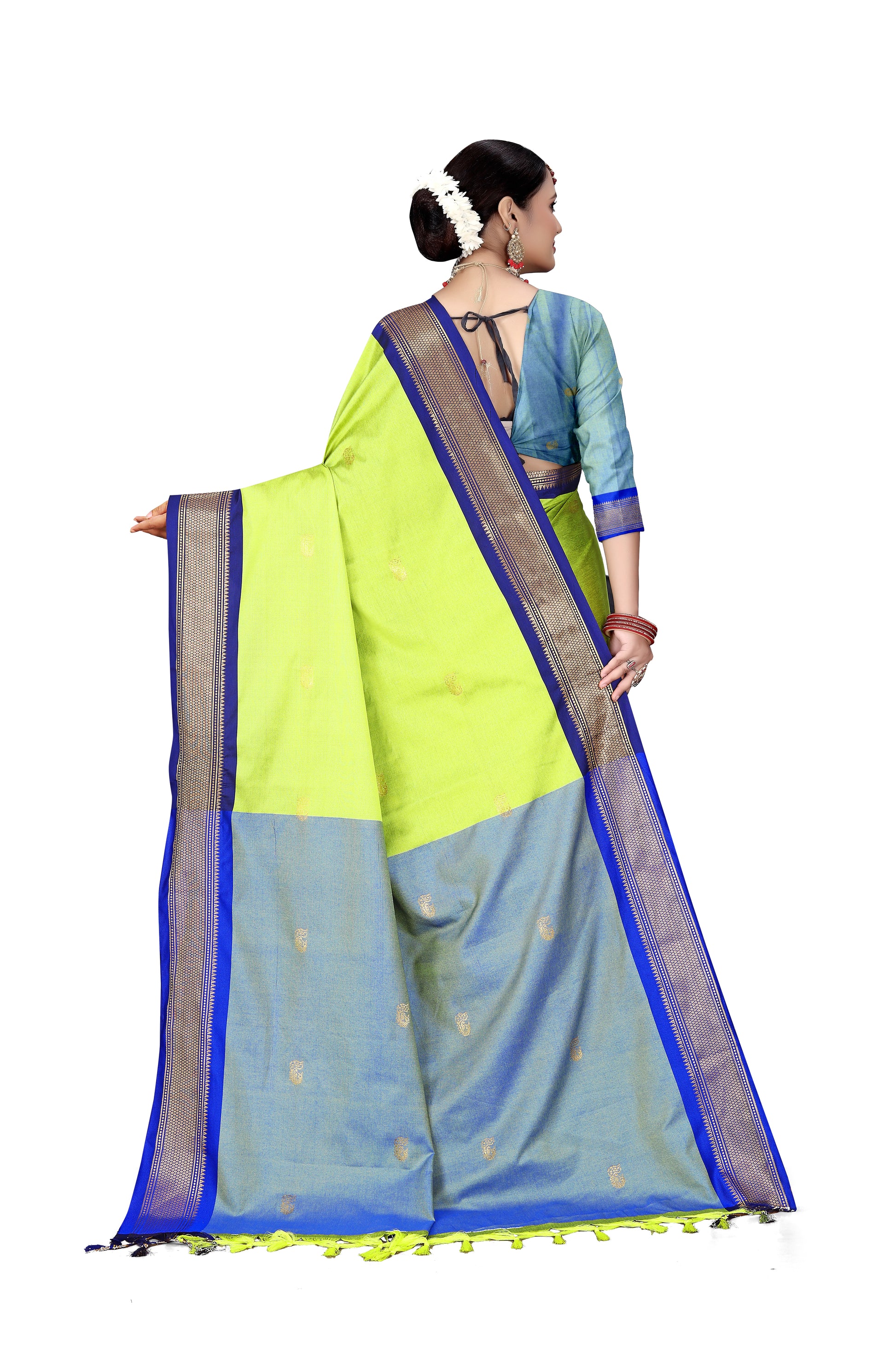 Lemon And Blue Cotton Silk Saree With Contrast Blouse And Contrast Pallu