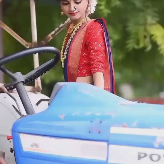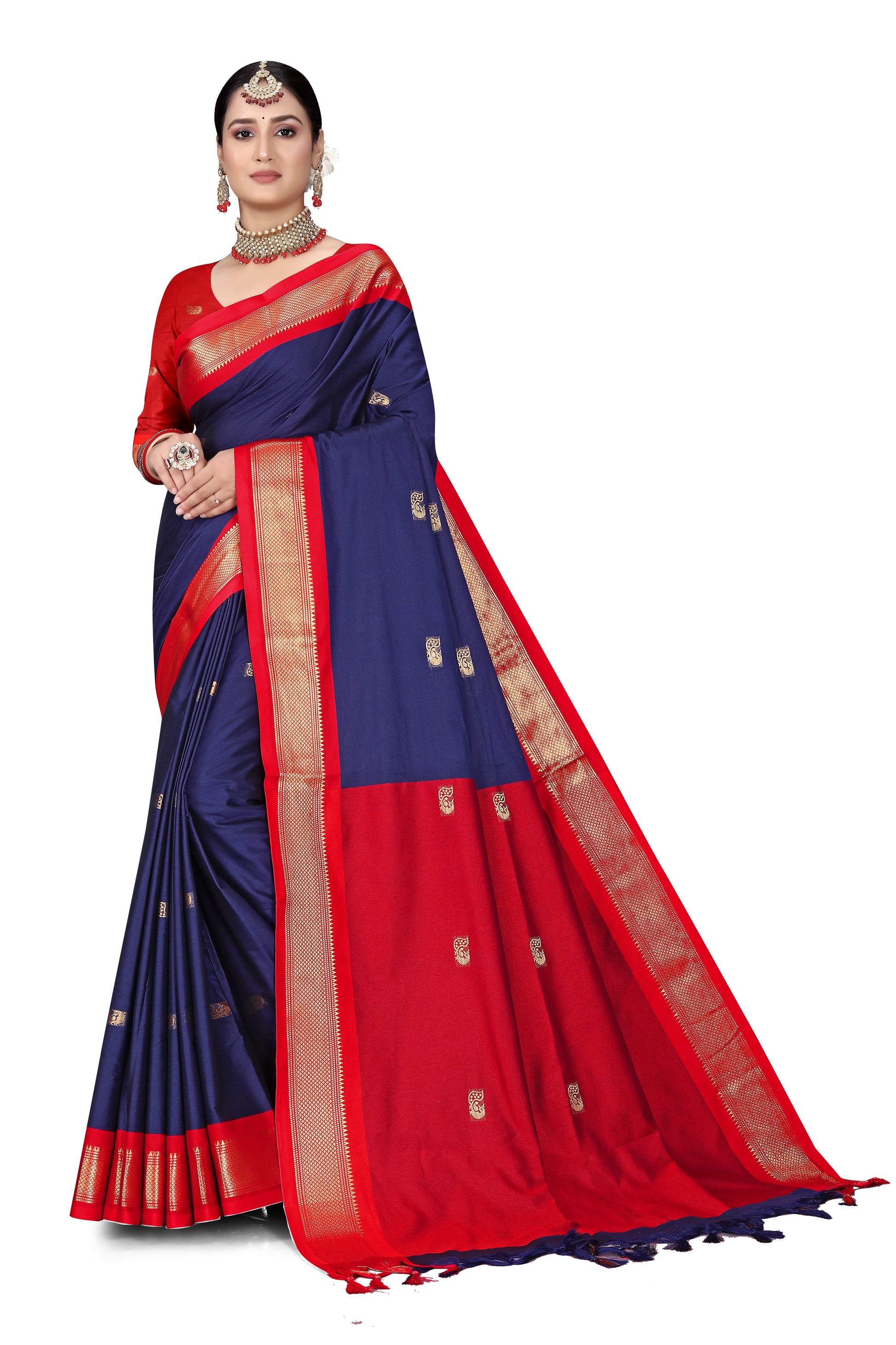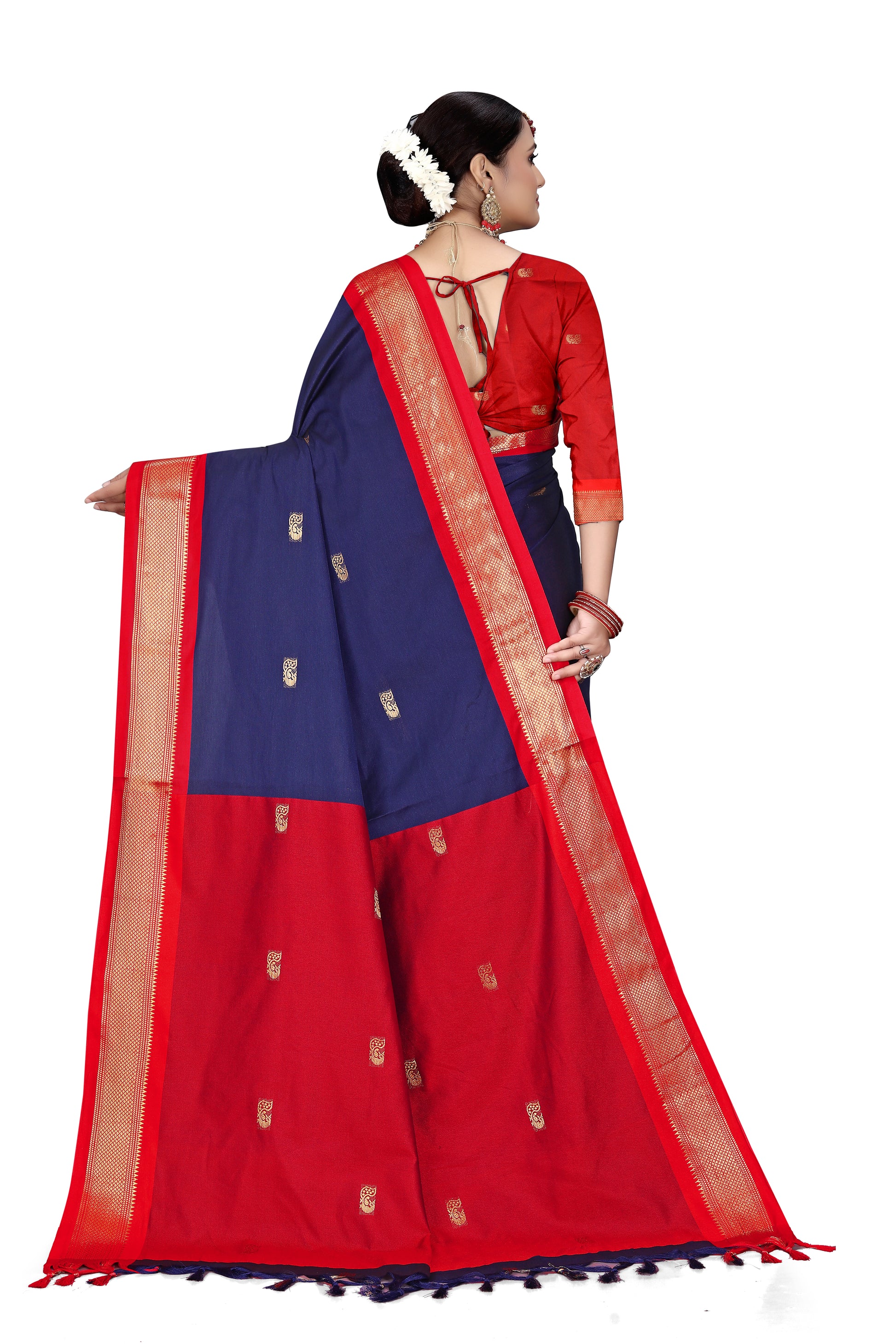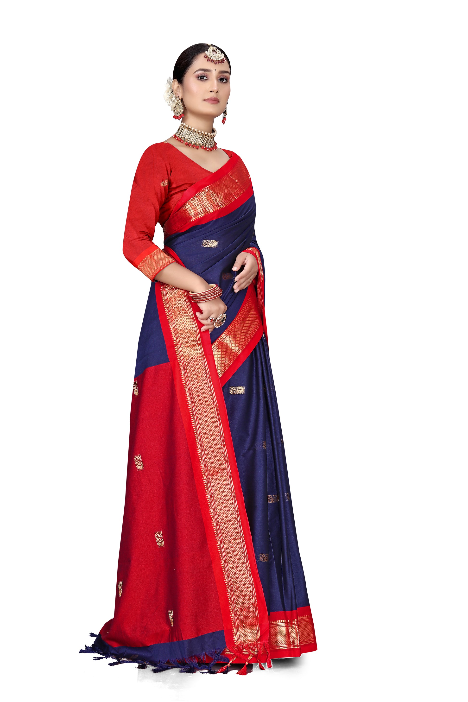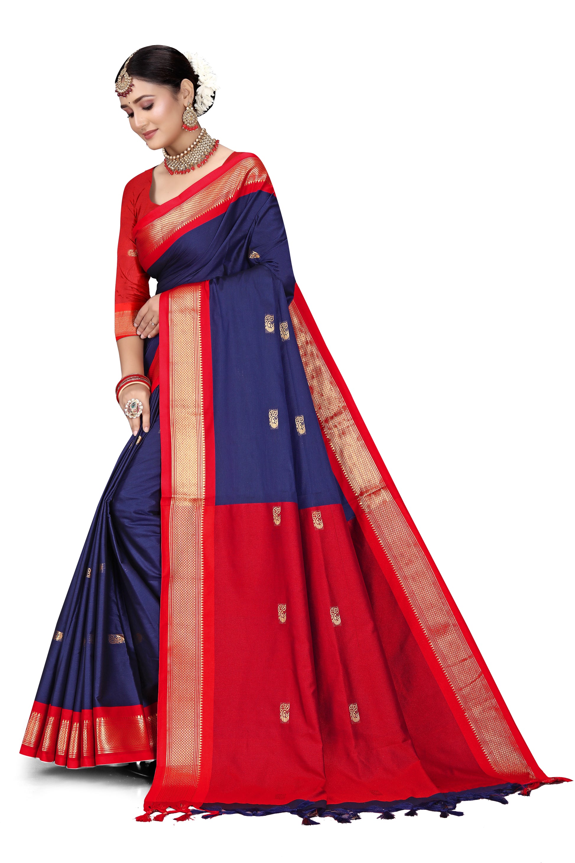 Measuring 5.5 meters, this saree is perfect for weddings, festivals, or parties. The matching blouse piece (0.80 meters) allows you to complete a coordinated look. Whether you're attending a formal event or simply wish to add a touch of luxury to your wardrobe, this Navy Blue and Red cotton silk saree will make you stand out in style.