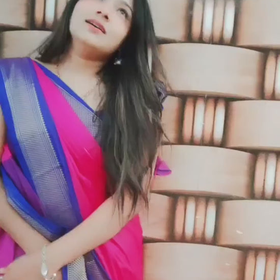 Pink And R.Blue Paithani Cotton Silk Saree With Contrast Blouse And Contrast Plain Pallu With Golden Zari Butta